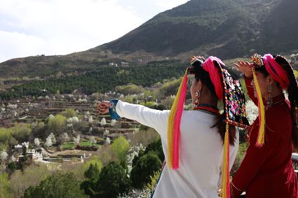 高大挺拔的梨樹如星星般散落在獨具特色的嘉絨藏族民居和古老碉樓附近。眼前看到的是雪白的梨花,身邊走過的是笑容比梨花還甜的藏族姑娘,交融成一道絕美的風(fēng)景線。