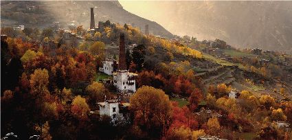 金秋,山寨呈現(xiàn)出一派多彩的畫面,樹葉漸次褪綠,漸染紅色,山頂是皚皚白雪,將田園牧歌式的畫卷展示在人們眼前。
