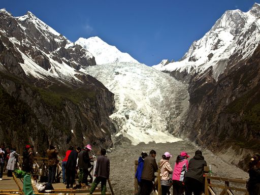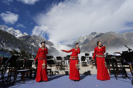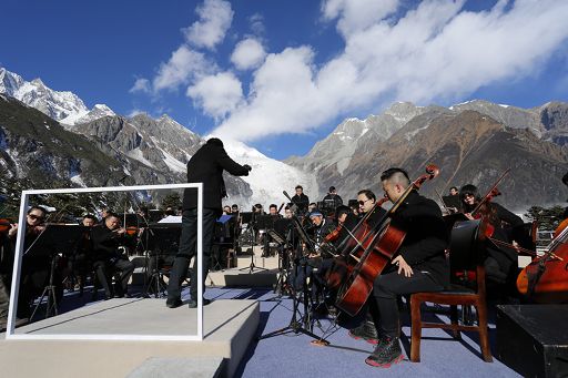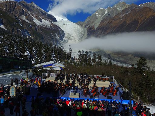 四號(hào)營(yíng)地,晴空萬里、風(fēng)和日麗,清澈的高原天空藍(lán)得澄明醉人,來自四川交響樂團(tuán)和民間的200多位樂手共同在海拔3500米的冰川瀑布之下演奏了《青藏高原》、《向往神鷹》、《菊花臺(tái)》等歌曲。