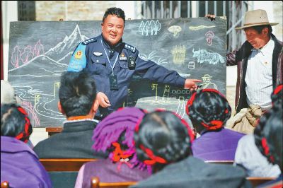 陽春三月,康定市甲根壩鄉(xiāng)扎日村壩子里,村民們圍在黑板前,認真聽著民警巴桑呷瓦妙趣橫生、詼諧幽默的“授課”,時不時發(fā)出開心的笑聲。