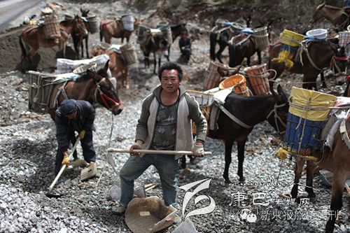 每天早上6點(diǎn)多,王玉海和同伴趕著騾子隊(duì),從白玉縣縣城旁邊的住地步行約1小時(shí)到達(dá)德沙村,約8開始從離索道橋約300米的路邊沙石場(chǎng)裝運(yùn)碎石。他們通常工作到下午5點(diǎn),每只騾子在海拔3000米左右的高度,來回運(yùn)送20次左右,每只騾子運(yùn)輸碎石大約在3000公斤左右。這些騾子正當(dāng)強(qiáng)壯年,年齡大約在三四歲,通常在坡度在30度以下的,最大負(fù)重約800斤。