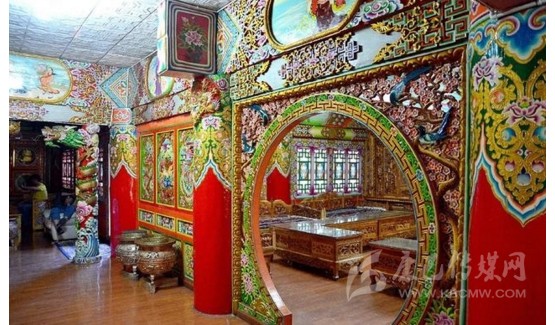 道孚民居室內(nèi)精雕細鏤,描金繪彩,每一個圖案或圖畫就是一個吉祥物或一個傳說。民居客廳陳設(shè)豪華,富麗堂皇,極顯主人的富有;經(jīng)堂供奉佛像,酥油燈長明,是家中的清靜之地;臥室多用箱式或椅式藏床,陳設(shè)溫馨而別具風(fēng)情。