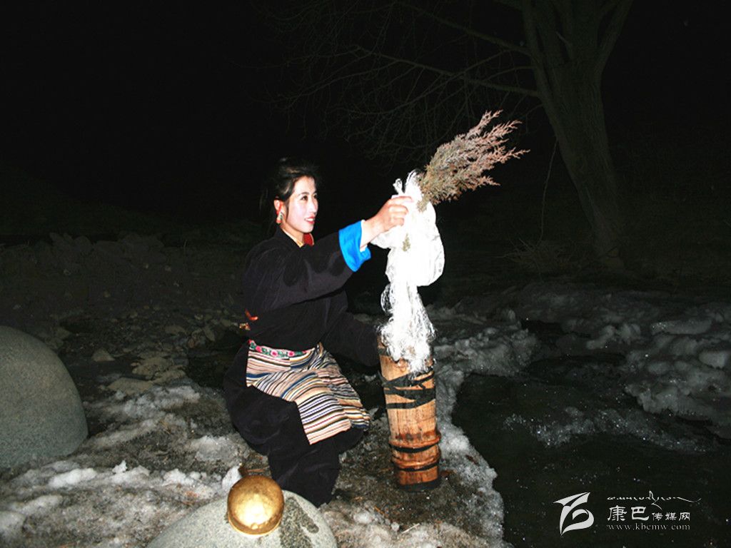 在除夕這天,家里的婦女會把庭院,房屋重新打掃一遍。把垃圾再清理一次。因為習俗認為,初一掃地和除垃圾會把一年的財運和好運都掃走。這天,大人小孩還要忙著洗頭、洗澡,搞好個人清潔衛(wèi)生。而除夕之夜最重要的一個儀式是“搶頭水”。(新年的第一桶水—晨星水)。傳說,晨星水是人間最吉祥的水。它可以獻神,可以潔身,可以祛病,洗滌一切污垢和不祥,帶來平安和幸福。從除夕夜十二時開始,一個個懷抱柏樹枝和哈達的姑娘或小伙子們披著繁星,爭先恐后地去背晨星水。第一個先到河邊的要熏燃桑煙,并用哈達繞上柏樹枝蘸水向空中拋灑三次,并把柏樹枝放在河邊。背回的晨星水首先要供奉佛祖。然后才可以用來燒茶、洗漱。而家里的五谷斗上則盛滿了糌粑、炒青稞粒、人參果等食品,上插青稞穗,也有在八寶碗里用糌粑和五彩酥油做成“切巴”,供奉在佛堂里。這一切都是為了祈禱來年風調(diào)雨順、人畜兩旺、喜獲豐收。除夕夜,在正房桌子上還要擺上各式油炸果子、牛肉坨坨、糖果以及青稞美酒、飲料等等美味佳肴,開始迎接新年的到來。