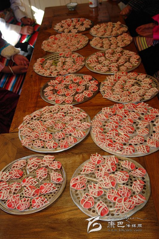 “花茹”是一種用面粉制作的糕點(diǎn),是巴塘人逢年過(guò)節(jié)、婚禮慶典等節(jié)慶日不可或缺的美食佳肴,可以這樣說(shuō),在節(jié)日期間或宴請(qǐng)賓朋之日,在眾多的糖果糕點(diǎn)中,如缺少了“花茹”,便自然就失去了巴塘風(fēng)味。
