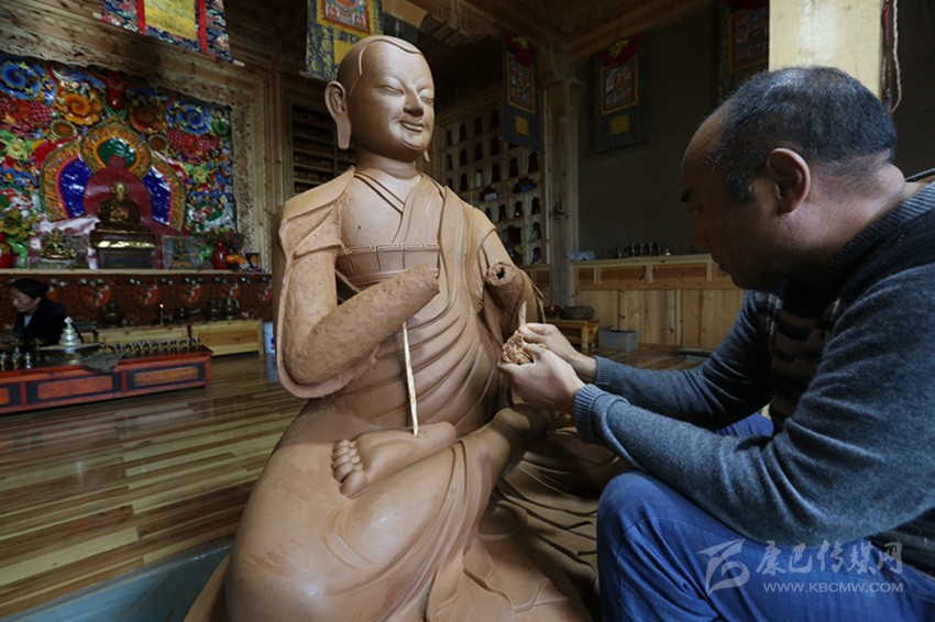 見到克村時,他正在鄰村一農(nóng)戶的經(jīng)堂里制作佛像,盤坐在蓮花寶座上的宗喀巴大師和兩個弟子身披袈裟手持經(jīng)書的泥塑作品神形兼?zhèn)?,這是克村和徒弟多登近半個月的心血。克村坐在布墊上,心無旁騖神情專注地,用木制工具對作品進(jìn)行打磨,旁邊擺放著一盆清水和一筐自制的工具。