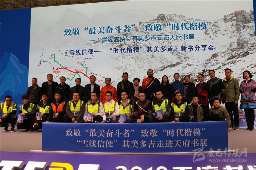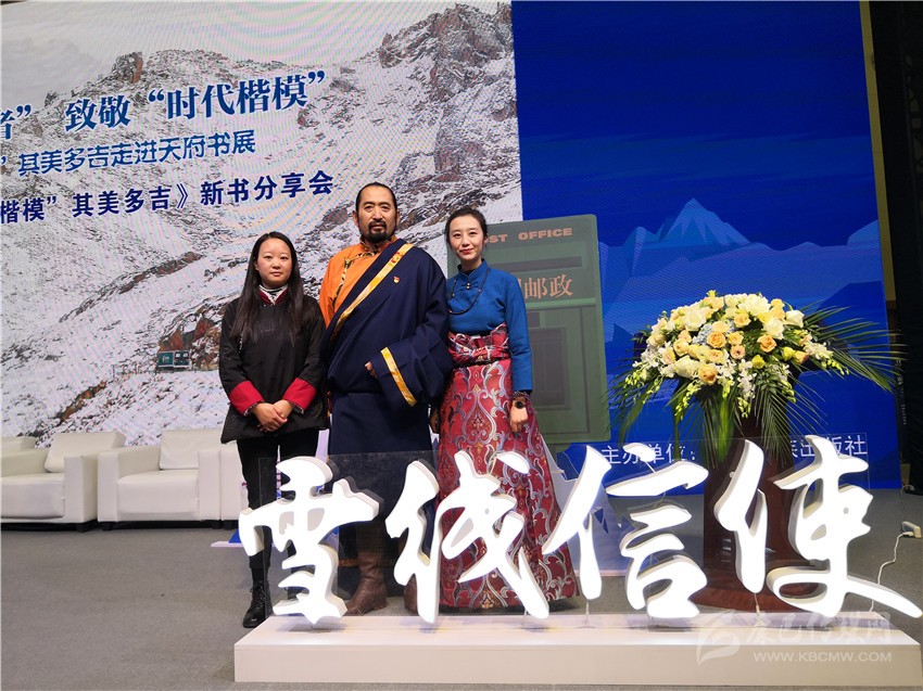 在分享會舞臺的一側,靜置著書籍《雪線信使——“時代楷模”其美多吉》放大后的封面。封面上,其美多吉、藍天與雪山相得益彰,構成了一幅獨具特色的畫面。