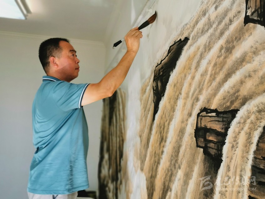 腳踏小步梯,左手端畫(huà)盤(pán),右手執(zhí)畫(huà)筆,輕蘸盤(pán)中墨,落筆成風(fēng)雨。6月22日,攀枝花市裴宏波家中,裴宏波的作畫(huà)風(fēng)采,讓記者一飽眼福。