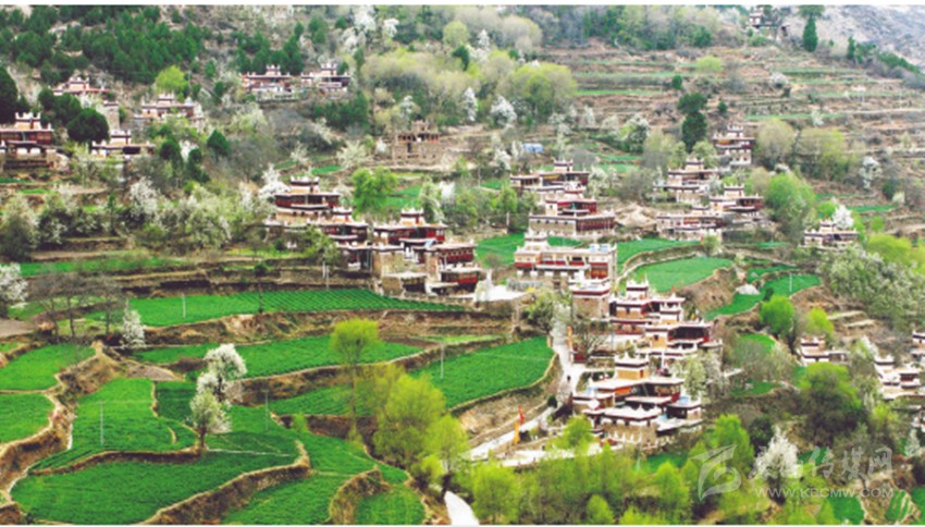 甲居,藏語是“百戶人家”的意思。實際上甲居藏寨分為一村、二村、三村共150余戶人家,700多人口,甲居藏寨所在地形如一個面積為5平方公里的大盆,大盆斜倚卡帕瑪群山,一棟棟外形別致、色彩鮮艷的典型嘉絨藏式民居錯落有致地從山腳一直排到半山。甲居人一代一代修造的梯田點綴民居之間,顯示出別具一格的田園韻味。茂密的柏樹掩映著民居,這些別致的民居不象故宮規(guī)模對稱,也不象蘇州園林隨興布局。碉樓式的民居雖無嚴格的統(tǒng)一規(guī)劃,但卻似乎不是隨意而建,每棟民居都有它獨特搶眼的風格。正是這些別具一格的座座碉樓民居,構成甲居藏寨的精妙絕倫。民居外所立的經(jīng)幡以及房頂隨風飄動的瑪尼旗,又為恬靜如詩的鄉(xiāng)土民居增添了無限神秘的色彩。祥云籠罩山頂,溪水潺潺環(huán)流,山腳滾滾河流,山水渾映,天水合一,筆者一行不由驚嘆,甲居藏寨 ,名符其實的人間仙境,世外桃源!先前道路險峻留在心底的驚懼早已一掃而光,一行人激動著迫不及待地撲身于美不勝收的仙境之中。