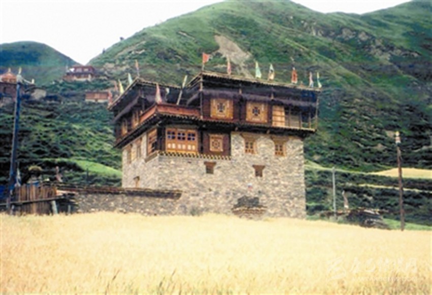 色爾壩藏寨以石頭、泥土、木頭為主要建筑原材料,絕不用水泥、鋼材等現(xiàn)代建材,甚至屋頂也不用瓦片,全部采用泥土,取材十分簡單、方便,然而因為修建全靠人工,工期較長,需要2-4個月或更長時間。當?shù)赝诵莞刹控晠s秋告訴筆者,藏寨房屋層數(shù)有較嚴格的規(guī)定,普遍為3—4層,不少于3層,也不會高于4層,分別象征一個人的頭部、胸部、腹部和腿;底層一般用來關牲畜或堆放雜物,第二層存貯糧食,第三層居住,第四層設置佛堂,這種建筑風格不同于周邊爐霍、道孚、丹巴民居,自成一體。藏寨造型完全擬人化,外形奇特,上大下小呈倒立的品字形,猶如一個頭戴盔甲、身披戰(zhàn)袍的將軍;房屋上層樓廊外部均以高山柳條垂掛環(huán)繞,以象征大將色爾哇·尼崩達雅的披肩長發(fā);房頂正中的小旗幟就象將士頭盔上的帽纓;房屋右側(cè)隨風飄拂的經(jīng)幡,恰似將軍手握長矛在沖鋒陷陣。房屋依山而建,傍山而立,外形高大雄偉。深厚的格薩爾文化為藏寨蒙上了一層神秘的面紗。