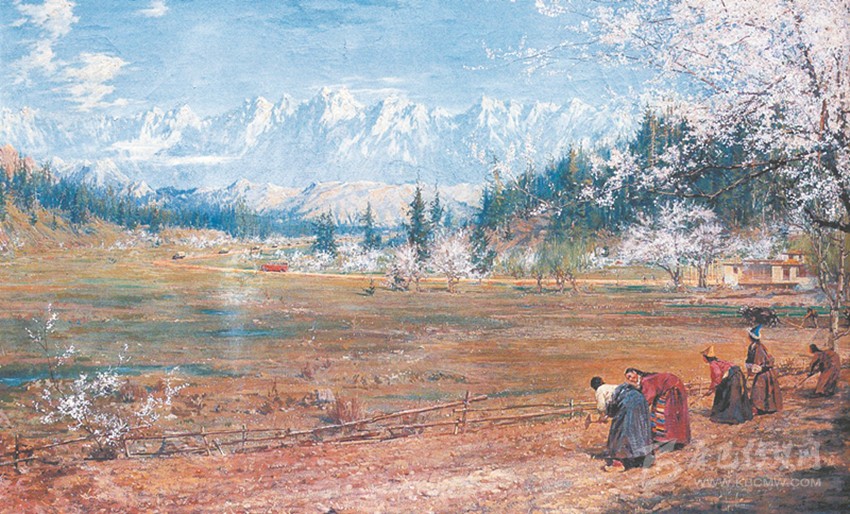 “西藏題材繪畫”主要是指內(nèi)地畫家從外部來關(guān)照西藏、表現(xiàn)西藏的繪畫作品。西藏題材繪畫經(jīng)歷了幾個(gè)不同的歷史時(shí)期:20世紀(jì)40年代,是內(nèi)地畫家初涉藏地采風(fēng),并在作品里反映青藏高原的風(fēng)土人情,讓觀眾去想象西藏民族的生活狀態(tài)。而在50-60年代的西藏題材繪畫作品里,承載的是西藏的社會巨變,以及當(dāng)時(shí)西藏人的時(shí)代風(fēng)貌。從80年代開始的“西藏?zé)帷本劢褂诓厝藢ψ匀坏淖鹬睾途次?,以及對“和諧共存”精神的贊揚(yáng)等等。