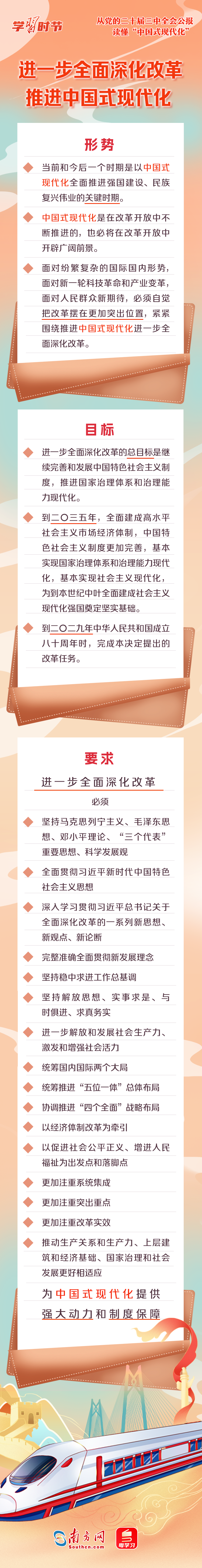 中國式現(xiàn)代化是中國共產(chǎn)黨和中國人民長期實(shí)踐探索的成果,是一項(xiàng)偉大而艱巨的事業(yè)。全會公報(bào)中,“中國式現(xiàn)代化”一詞被反復(fù)提及,深刻闡述了進(jìn)一步全面深化改革與推進(jìn)中國式現(xiàn)代化的關(guān)系,以及中國式現(xiàn)代化的重要保障、必然要求、本質(zhì)要求等重要內(nèi)容。一起來學(xué)習(xí)!