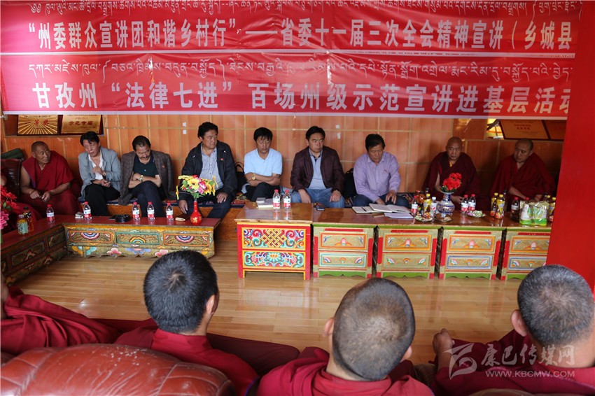 本網(wǎng)訊 按照州委統(tǒng)一安排部署,7月27日下午,州委群眾宣講團(tuán)深入色達(dá)縣色柯鎮(zhèn)東嘎寺開(kāi)展了“州委群眾宣講團(tuán)和諧鄉(xiāng)村行”——省委十一屆三次全會(huì)精神暨“法律七進(jìn)”百場(chǎng)州級(jí)示范宣講進(jìn)基層活動(dòng)。
