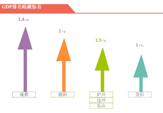 成都達(dá)到13889.4億元,即將探到1.4萬(wàn)億的臺(tái)階,在川內(nèi)一枝獨(dú)秀。綿陽(yáng)實(shí)現(xiàn)歷史性跨越,GDP總量達(dá)到2074.8億元,成為我省首個(gè)跨過(guò)2000億門(mén)檻的地級(jí)市;簡(jiǎn)陽(yáng)由成都代管后的第二年,資陽(yáng)市GDP重回“千億俱樂(lè)部”,GDP達(dá)到1000億元的市州增加至16個(gè)。