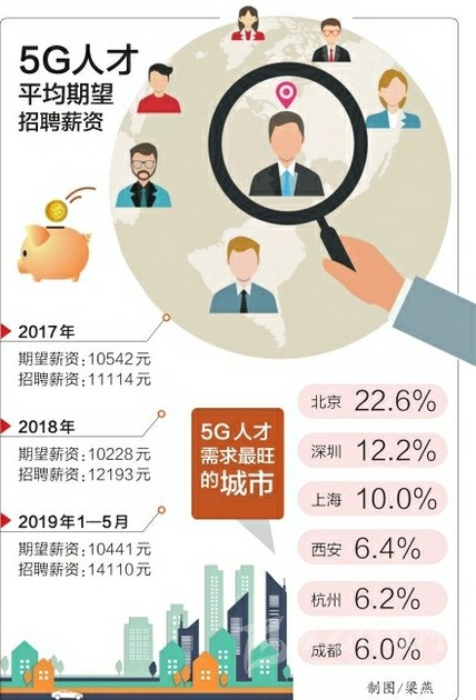 數(shù)據(jù)顯示,今年1—5月,5G相關(guān)人才平均招聘月薪為14110元,較2018年平均月薪水平高出15.7%,其增幅較2018年高出6個(gè)百分點(diǎn)。3年來,企業(yè)的5G人才招聘預(yù)算在逐年增高,平均招聘月薪大幅上漲,但求職者的平均期望薪資卻一直低于平均招聘薪資。相較于此前運(yùn)營(yíng)商官方表述的“2020年5G正式商用”時(shí)間表,工信部將5G牌照至少提前了半年發(fā)放。5G的提前商業(yè)化和激烈的競(jìng)爭(zhēng)使得企業(yè)對(duì)于相關(guān)人才的需求更加的迫切,從不斷飆升的平均招聘月薪中可見一斑。