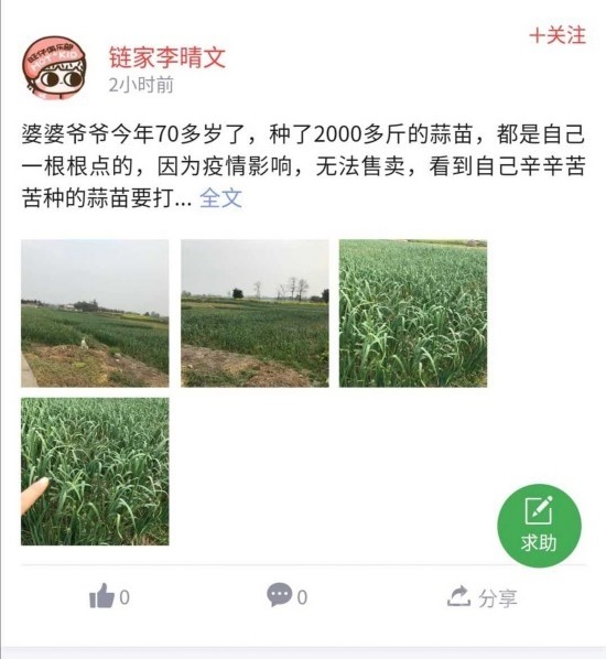 “婆婆爺爺今年70多歲了,種了2000多斤的蒜苗,都是自己一根根點(diǎn)的,因?yàn)橐咔橛绊?,無法售賣,看到自己辛辛苦苦種的蒜苗要打水漂,兩個(gè)老人都要急哭了?!奔易〕啥寂碇菔械睦钚〗阃ㄟ^“抱團(tuán)助農(nóng)戰(zhàn)疫”平臺(tái)求助表示,希望能夠幫忙盡快處理這些蒜苗。