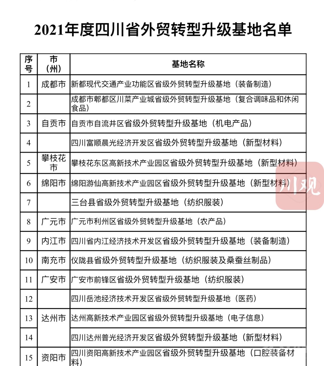 建設(shè)外貿(mào)轉(zhuǎn)型升級基地是穩(wěn)定和暢通外貿(mào)產(chǎn)業(yè)鏈、供應(yīng)鏈、推進(jìn)貿(mào)易高質(zhì)量發(fā)展的重要舉措。2020年,商務(wù)廳等省級9部門印發(fā)了《關(guān)于加快推進(jìn)四川省外貿(mào)轉(zhuǎn)型升級基地建設(shè)的實(shí)施意見(2020—2025年)》,計(jì)劃用5年時(shí)間,在全省培育外貿(mào)基地40個(gè)。2020年,首批15個(gè)基地率先亮相。