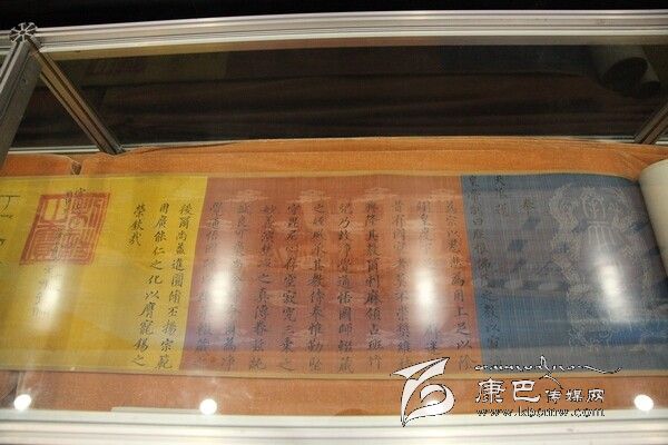 據(jù)介紹,明成祖永樂(lè)十一年封誥為國(guó)家一級(jí)文物,系明永樂(lè)帝成祖朱棣于明永樂(lè)十一年(1413)敕封噶瑪噶舉楚布寺第二世司徒活佛曲吉降村為“灌頂圓通妙濟(jì)國(guó)師”時(shí)頒賜的。該封誥質(zhì)地為宮廷誥文專(zhuān)用彩色云綾紋錦,由藍(lán)、明黃、白、灰、褐五色錦帛分段依次裱接為手卷形制。封誥用漢藏兩種文字墨書(shū),漢文居右、直行,共20行、145字、楷書(shū);藏文居左、橫行、共四行、行書(shū)。封誥右藍(lán)色錦帛織二龍及“奉天誥命”四字。該封誥真實(shí)地記載了明王朝敕封噶瑪噶舉派高僧,有效管理藏區(qū)地方事務(wù)的史實(shí),對(duì)研究明代中央王朝與藏區(qū)關(guān)系具有重要的史料價(jià)值。