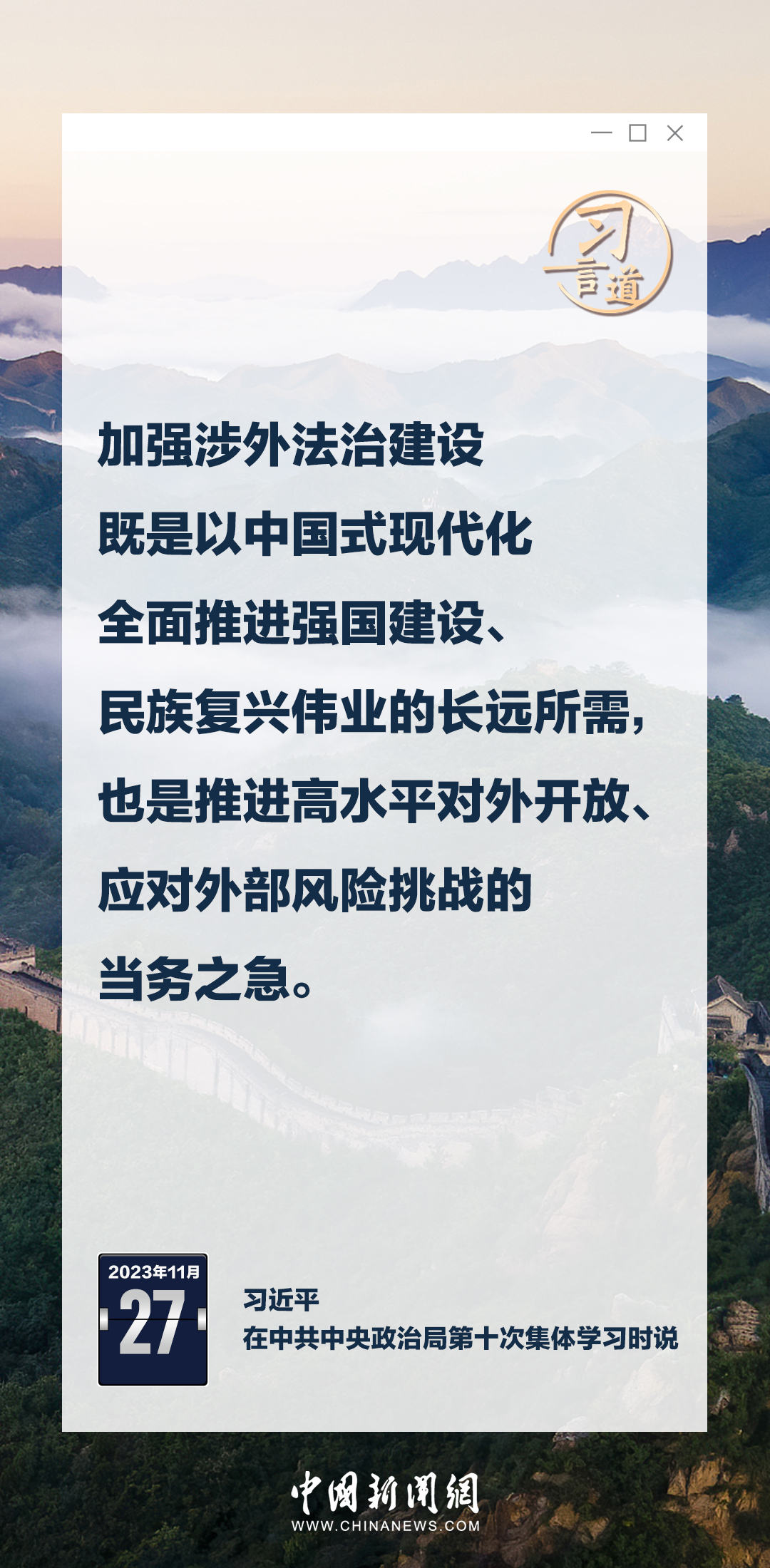中共中央政治局11月27日下午就加強(qiáng)涉外法制建設(shè)進(jìn)行第十次集體學(xué)習(xí)。中共中央總書(shū)記習(xí)近平在主持學(xué)習(xí)時(shí)強(qiáng)調(diào)——
