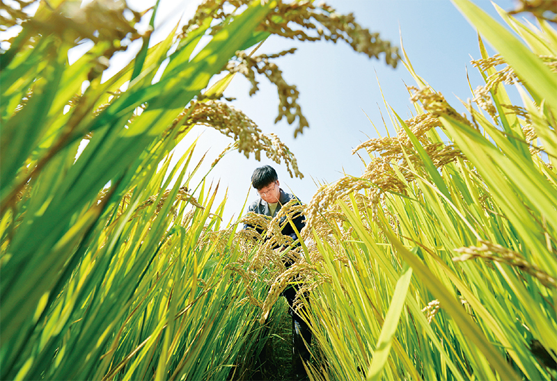 近年來,河北省唐山市通過鹽堿地土壤科學(xué)改良、耐堿作物品種培育、適用耕作技術(shù)研究應(yīng)用等系列治理措施,在鹽堿地上開發(fā)建設(shè)了高標準農(nóng)田88.6萬畝,有效提高鹽堿地利用水平。圖為2023年10月11日,農(nóng)業(yè)科研人員在唐山市曹妃甸區(qū)第五農(nóng)場鹽堿地改良而成的高標準稻田內(nèi)工作。 新華社記者 楊世堯/攝