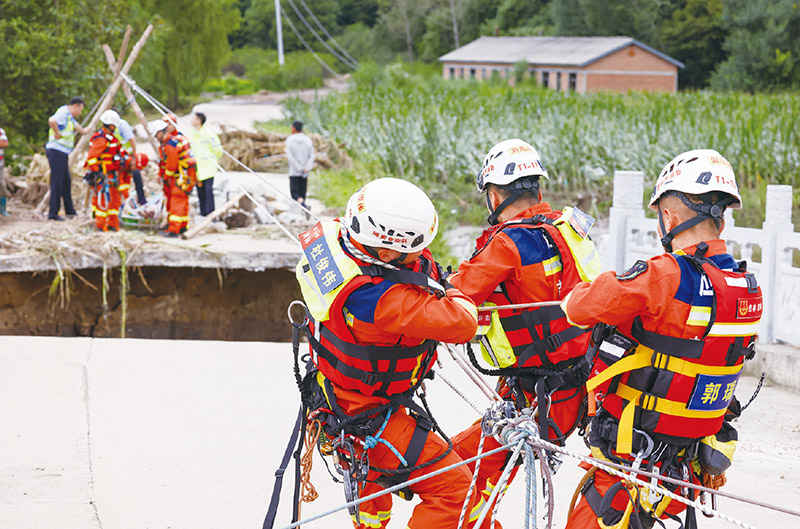 2023年夏,面對影響華北、黃淮、東北等地的嚴(yán)重汛情,在以習(xí)近平同志為核心的黨中央堅(jiān)強(qiáng)領(lǐng)導(dǎo)下,廣大黨員干部為守護(hù)人民生命和財(cái)產(chǎn)安全挺身向前,千千萬萬人民群眾為保衛(wèi)家園頑強(qiáng)奮戰(zhàn)。圖為8月6日,吉林省吉林市消防救援支隊(duì)隊(duì)員利用繩橋解救受困村民。 新華社記者 顏麟蘊(yùn)/攝