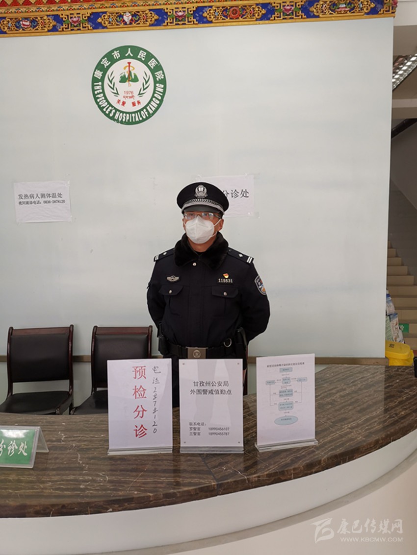 民警在康定市人民醫(yī)院預(yù)檢分診臺執(zhí)行外圍警戒任務(wù)。