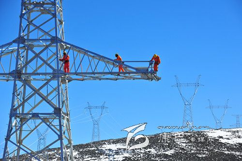 電力天路川藏聯(lián)網(wǎng)工程特別報(bào)道 11月中旬,寒風(fēng)凜冽,滴水成冰。為確保我州“電力天路”無(wú)電地區(qū)和農(nóng)網(wǎng)改造建設(shè)工程明年3月份按時(shí)完工 ,四川電力公司的各路建設(shè)者,依舊保持 著旺盛的工作斗志,吃住在各施工現(xiàn)場(chǎng),奮戰(zhàn)在高寒缺氧地域。圖為11月12日,電力員工奮戰(zhàn)在雅江縣境內(nèi)海拔 4412米的施工地段,登塔作業(yè)。 (楊林 攝影報(bào)道)