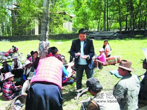 康定縣農(nóng)村信用合作社職工下鄉(xiāng)宣傳信貸政策,并對(duì)村民進(jìn)行評(píng)級(jí)授信,發(fā)放小額農(nóng)戶信用貸款證。