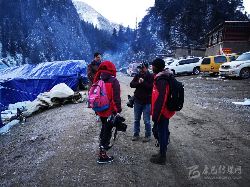 11月6日晚,甘孜日報記者馬建華、張磊、余秋林和州廣播電視臺副臺長何良忠、記者洛嘎、肯布及白玉電視臺記者連夜趕赴則巴村中轉站。26公里的崎嶇山路,冰雪道危險重重,坡陡彎急,司機憑借經驗在坡度60度以上的暗冰道上行駛,經過兩個多小時的艱難行進,采訪組終于入住前方救災組搭建的救災帳篷。深夜,大雪紛揚,帳篷里寒氣襲人。帳篷四周,狗叫聲不止,一條狗鉆進帳篷,蜷縮在記者床鋪旁邊,因為太冷,記者們不忍心將它驅離。11月7日,白格堰塞湖庫容量達到2.71億立方米,白格堰塞湖形勢嚴峻,嚴重威脅我州金沙江下游群眾生命財產安全。一大早,10多公分厚的大雪扮美了村莊,卻給機具、救災物資、救援人員進出等帶來極大困擾?!拔覀兊耐诰驒C司機在山上被大雪困了一夜,徒步到中轉站休息了三個小時又到山上去作業(yè)了,你們應該去采訪一下?!敝菡敝蓍L何康林說。