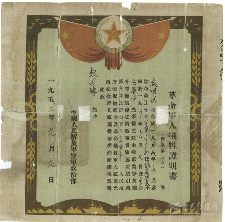 但《革命軍人犧牲證明書》上卻是字字泣血的消息:魏國(guó)斌(魏國(guó)賓)同志不幸于1952年6月7日?qǐng)?zhí)行西線任務(wù)空投物資時(shí)光榮犧牲。