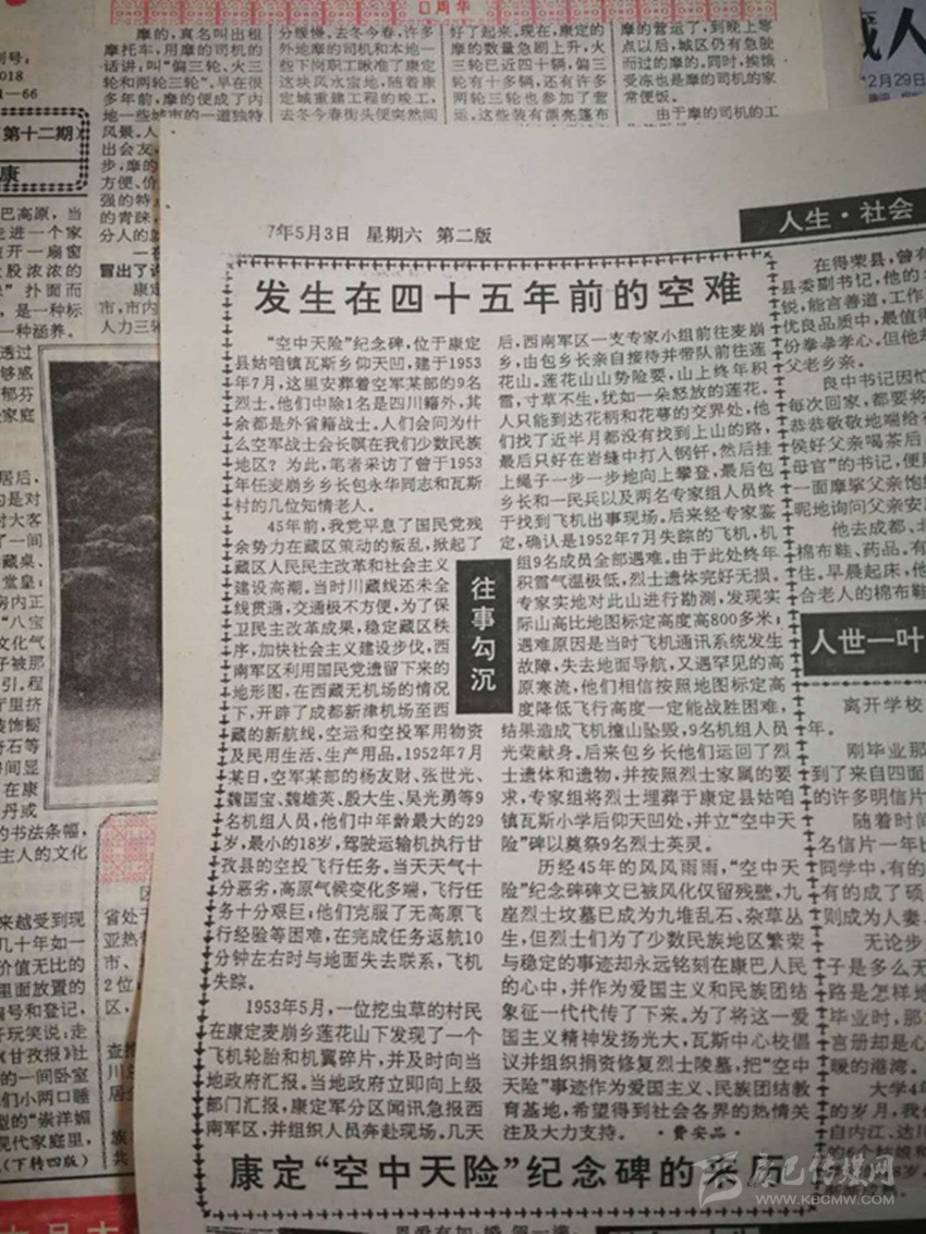 《甘孜日?qǐng)?bào)》1997年5月3日第二版刊登了《發(fā)生在四十五年前的空難——康定“空中天險(xiǎn)”紀(jì)念碑的來(lái)歷》一文,詳細(xì)記錄了1952年空軍某部9名人員駕駛運(yùn)輸機(jī)執(zhí)行空投飛行任務(wù),不幸在康定地區(qū)撞山墜毀,英勇犧牲的故事。這9名烈士后被當(dāng)?shù)厝罕姲苍幔ⅰ翱哲娔埂焙汀翱罩刑祀U(xiǎn)”紀(jì)念碑。 作為烈士犧牲地的甘孜多年來(lái)一直在尋找這9名烈士家屬,以圖告慰英靈。但由于線索有限,一直未有結(jié)果。