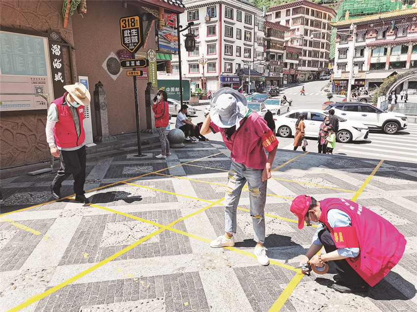 康定市志愿者正在粘貼核酸檢測排隊間隔線。