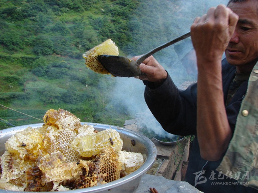 這時(shí)候,一位城里人開(kāi)著車(chē)來(lái)到他家里,前來(lái)購(gòu)買(mǎi)蜂蜜。蘭友才提著火爐,在里面撒上柏樹(shù)枝椏,打開(kāi)蜂箱蓋子后,將煙霧吹進(jìn)蜂箱里。不一會(huì)兒,蜜蜂們紛紛飛出巢穴,在幾十米開(kāi)外不停的飛翔、徘徊,只留下滿(mǎn)箱雪白的蜂蠟一排排整齊的豎立在那里。蘭友才拿出一把刀,輕輕地在蜂蠟上割取,并迅速將浸滿(mǎn)琥珀色糖液的蜂蠟放進(jìn)瓷盆里。蘭友才告訴我,蜂蠟的上半部分為蜂蜜,下半部分是蜂蛹的巢穴,因此只割取上半部分。
