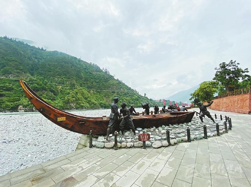 不遠處的安順場渡口、大渡河邊,矗立著一座“紅軍渡”石碑,上面的三個鮮紅大字由渡河時任第一軍團第一師一團團長楊得志題寫。石碑旁陳列著的一艘長10.5米、寬2.3米、高2.2米的“紅軍船”,正是當(dāng)年紅軍強渡大渡河時使用的翹首木船復(fù)制品。木船旁,是戰(zhàn)士和當(dāng)?shù)卮兿蚰敬\送武器裝備的雕像,斜坡上,勇士隊伍正奔向渡口。