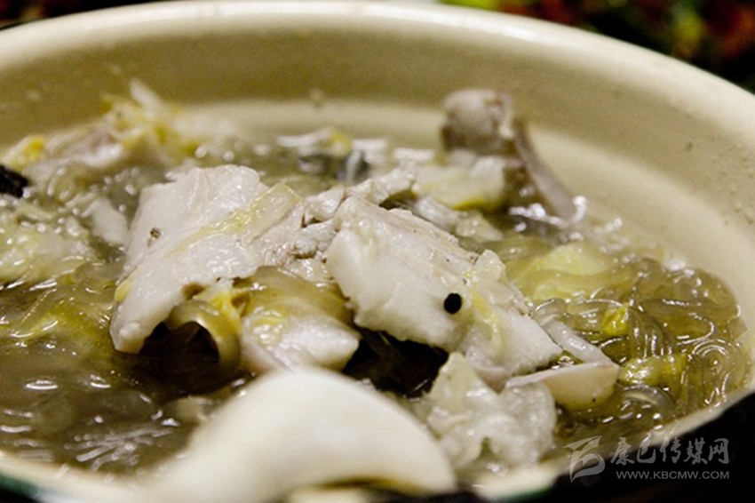 3、攪團:將清水在鍋內(nèi)燒開后,逐量撒入極細的玉米面粉,以當年新產(chǎn)的小金黃玉米粉為佳,用竹筷攪拌,此時灶中火要猛,直到攪成糊狀,然后蒙蓋一層新鮮潔凈的芭蕉葉或青菜葉,再蓋上鍋蓋文火蒸20—30分鐘,用大碗盛起;鍋內(nèi)打油湯,燒煮酸油菜湯,其油鹽調(diào)料如一般湯羹(酸油菜即以野生油菜莖葉,洗凈,在開水鍋內(nèi)略煮一下,即撈起置于木盆或瓷盆內(nèi),趁熱壓緊覆蓋閉氣,隔夜后即成一種酸味菜,可炒食,亦可煮湯食,其味略酸而鮮美爽口,并有一種特殊香味,本地人歷來皆愛食之。