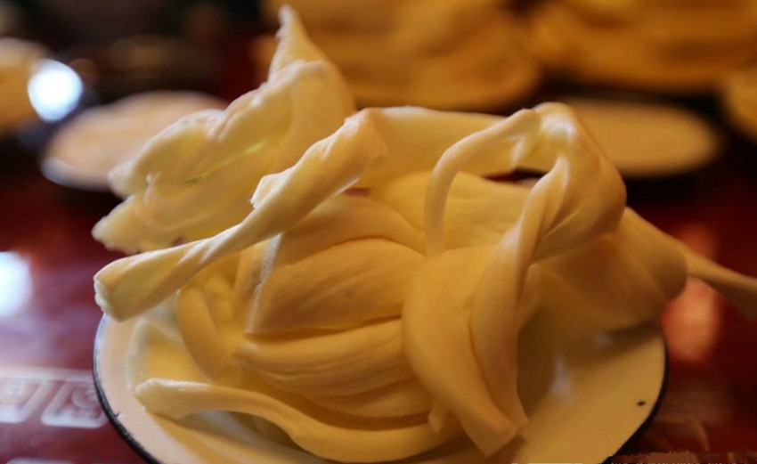 奶餅在木雅地區(qū)的種類較多,一種是用未提煉酥油的奶酪制成,不帶酸味,稱“甜奶餅”,形同小鍋盔,有兩層較厚的酪皮;另一種是“麻花絞”奶餅形同麻花,撕開(kāi)呈纖維狀,是用提煉過(guò)酥油的奶酪制成;還有一種是各地都普遍制作的“本脫”,呈坨狀;將“本脫”揉搓成顆粒狀,曬干即成奶渣。